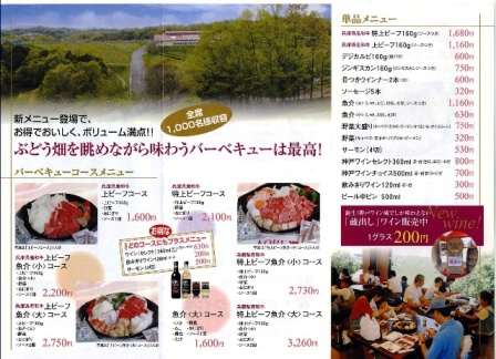 | 農業公園ワイン城から昼食のお知らせ ぶどう畑を眺めながら味わうバーべキューは最高! [ 農業公園ワイン城のバーベキュー場 ]は、全席1,000名様収容規模。 下の画像クリックで拡大します 営業時間10:30〜16:30(オーダーストップ) お勧めコースメニュー